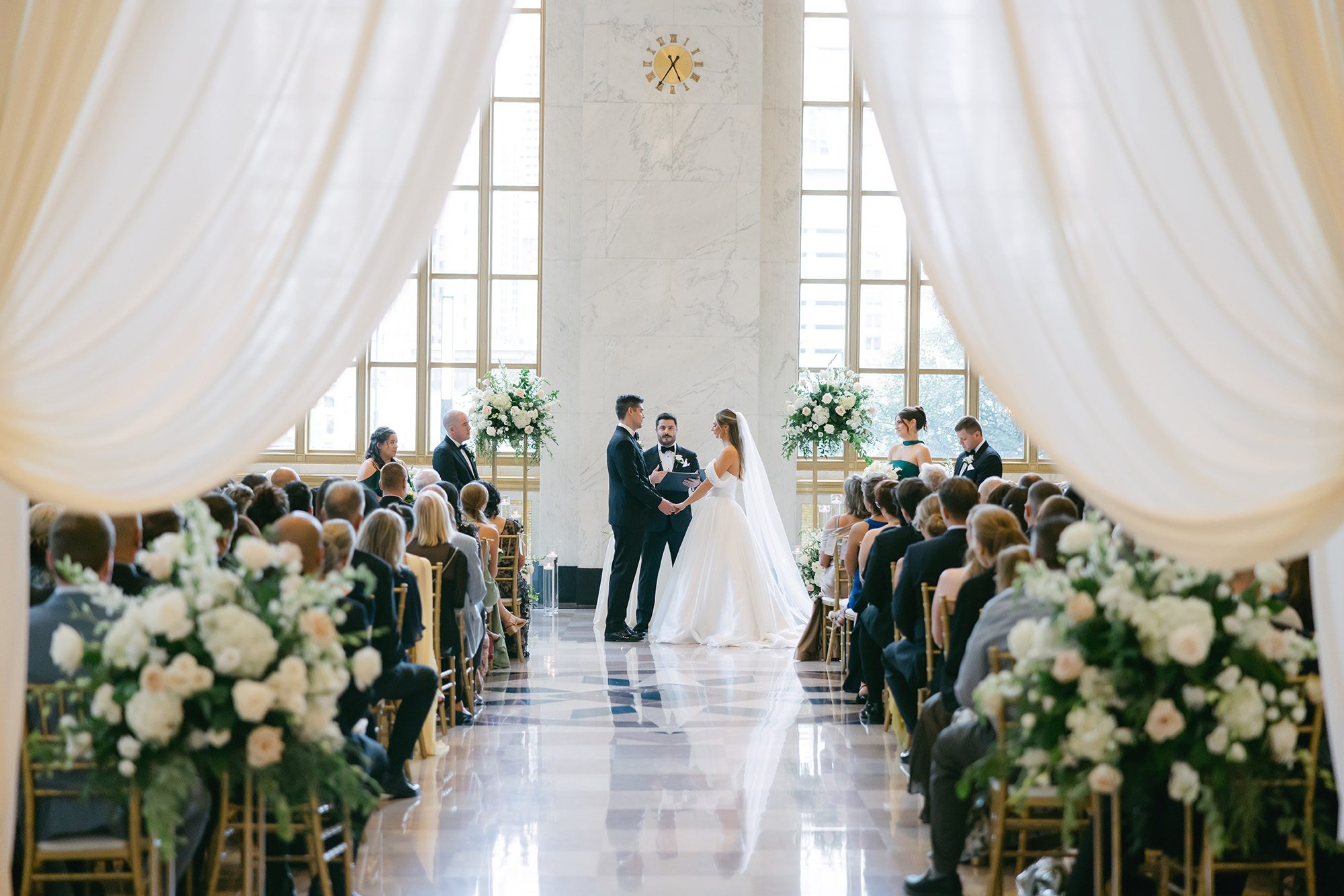 The ceremony embodied romance and timeless beauty. Shamrock Gardens designed lush, graceful floral arrangements that framed the space, while Cloud Gate String Quartet performed live music that enhanced the grandeur of The Old Post Office. Each moment felt polished and purposeful, capturing the essence of a sophisticated Chicago wedding.